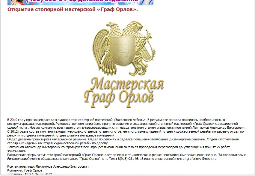В феврале 2012 года была создана столярная мастерская «Граф Орлов».